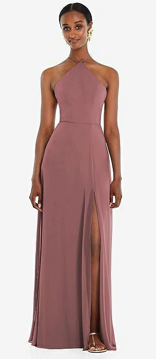 Stand Collar Halter Maxi Dress with Criss Cross Open-Back in rosewood