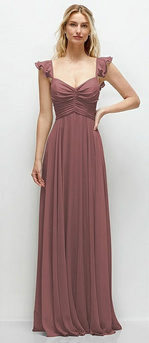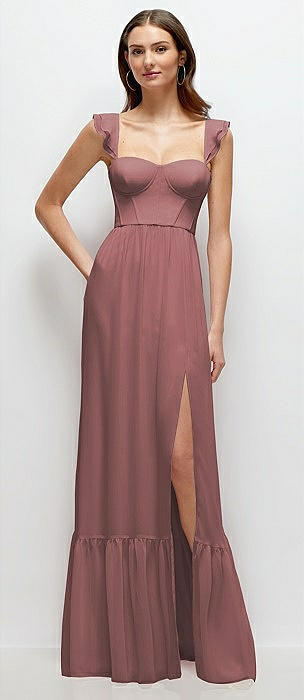 Ruffle Strap Chiffon Bustier Maxi Dress with Ruffle Hem A-Line Skirt in rosewood