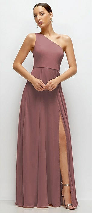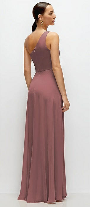 One-Shoulder Chiffon Maxi Dress with Shirred Front Slit in rosewood