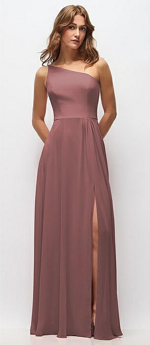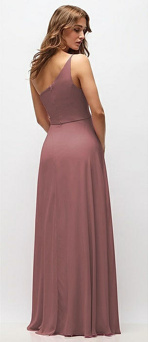 One-Shoulder Chiffon Maxi Dress with Shirred Front Slit in rosewood