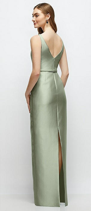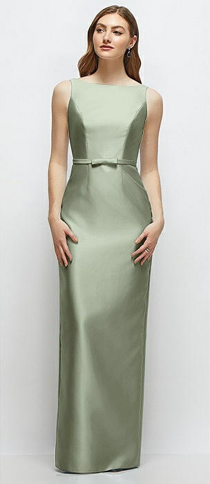 Bateau Neck Satin Column Dress with Bow-Trimmed Skinny Belt in sage