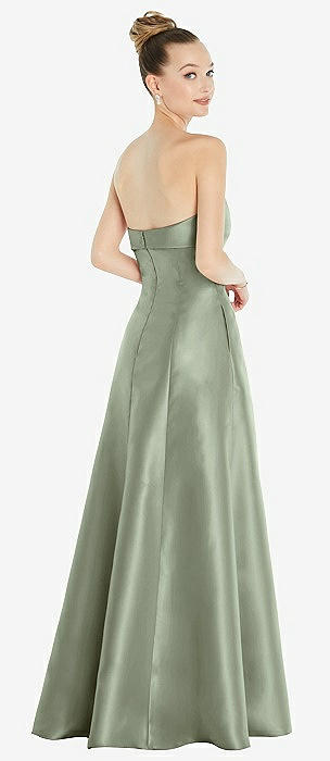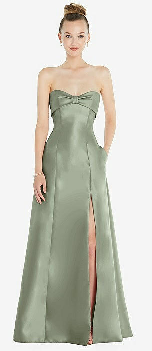 Bow Cuff Strapless Satin Ball Gown with Pockets in sage