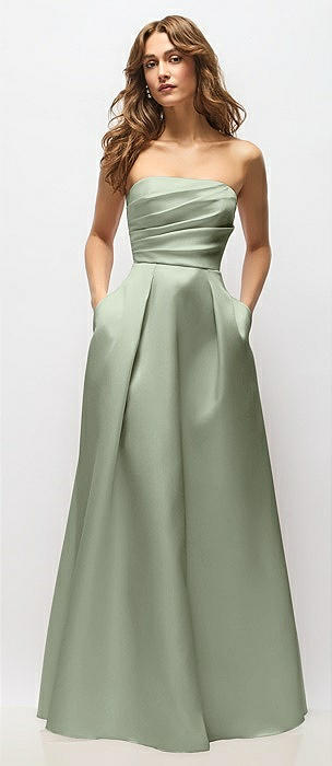 Strapless Bias Cuff Bodice Satin Gown with Pockets in sage