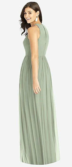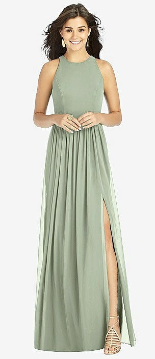 Shirred Skirt Jewel Neck Halter Dress with Front Slit in sage