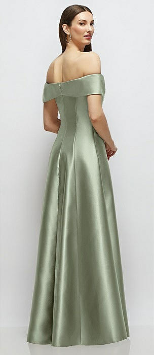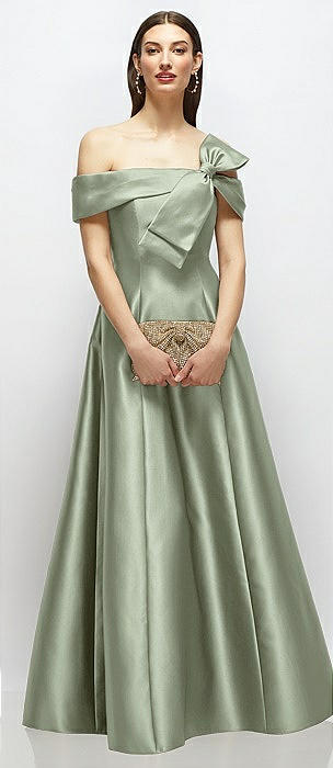 Asymmetrical Bow Off-Shoulder Satin Gown with Ballroom Skirt in sage