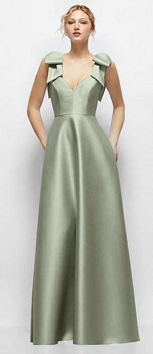 Deep V-Neck Satin Ball Gown with Shoulder Bows in sage
