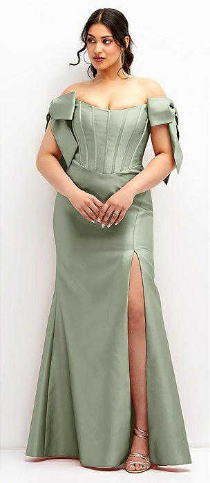 Off-the-Shoulder Bow Satin Corset Dress with Fit and Flare Skirt in sage
