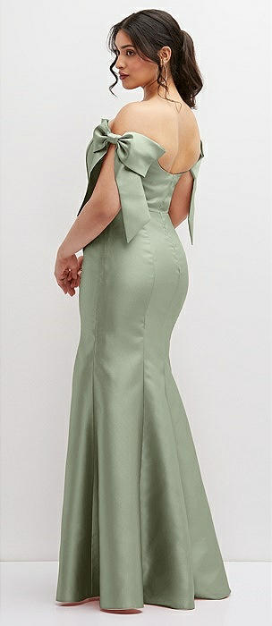 Deep V-back Satin Trumpet Dress with Cascading Bow at One Shoulder in sage