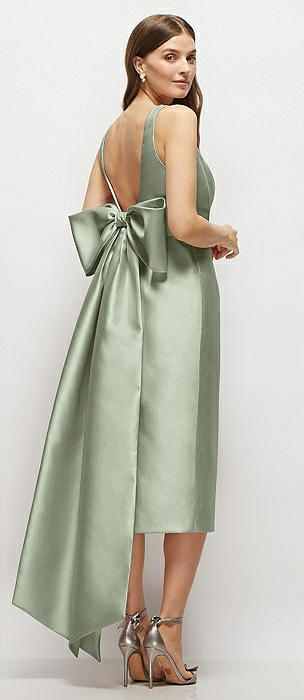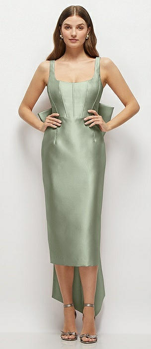 Scoop Neck Corset Satin Midi Dress with Floor-Length Bow Tails in sage