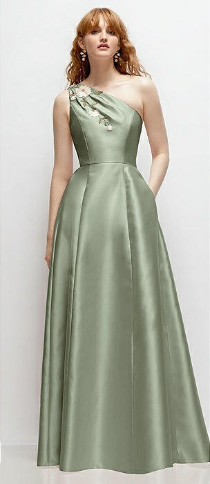 One-Shoulder Full A-Line Satin Gown with Handworked Floral Appliqué in sage