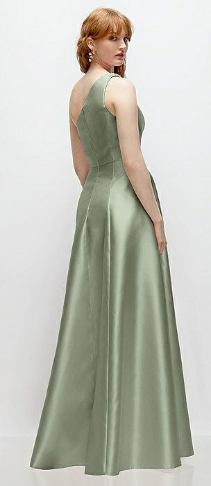 One-Shoulder Satin Gown with Draped Front Slit and Pockets in sage