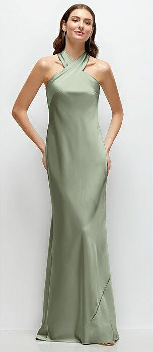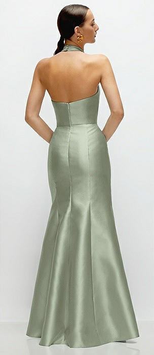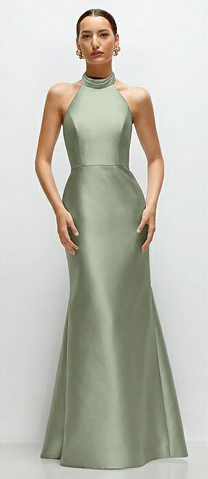 High-Neck Halter Open-Back Satin Trumpet Dress in sage