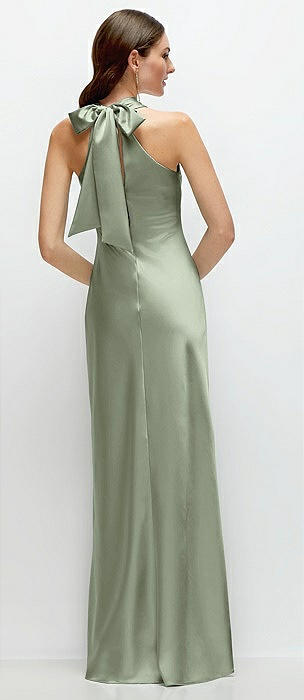 Band Collar Halter Open Back Fluid Satin Maxi Dress with Self-Tie Bow in sage