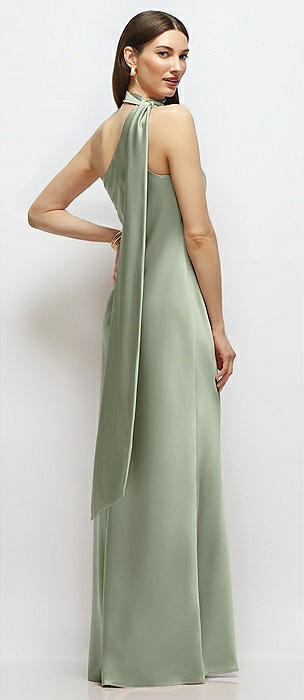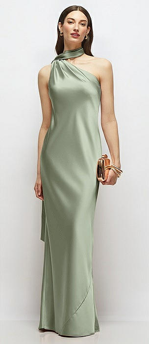 Draped Scarf One-Shoulder Bias Stretch Satin Maxi Dress in sage