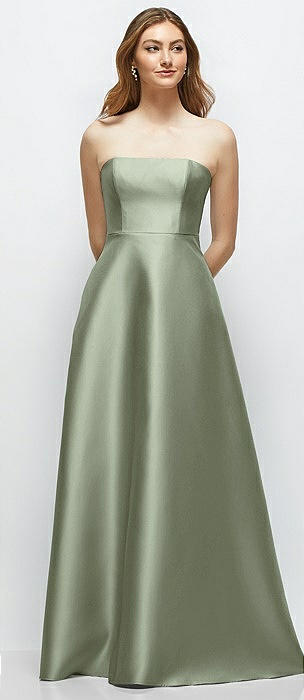 Strapless A-Line Stretch Satin Maxi Dress in sage