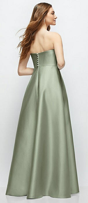 Strapless Satin Gown with Full Skirt and Covered Buttons at Back in sage