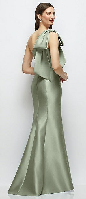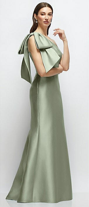 Bow One-Shoulder Satin Maxi Dress with Trumpet Skirt in sage