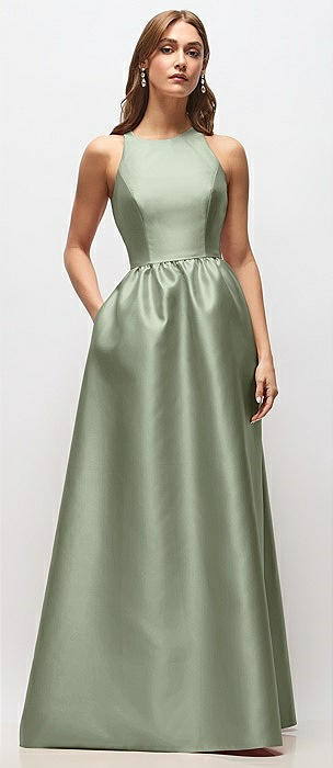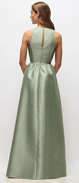 High Neck Sleeveless Cap Shoulder Satin Maxi Dress in sage