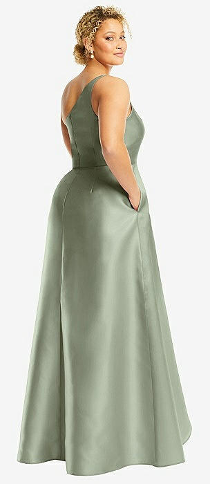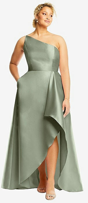 One-Shoulder Satin Gown with Draped Front Slit and Pockets in sage