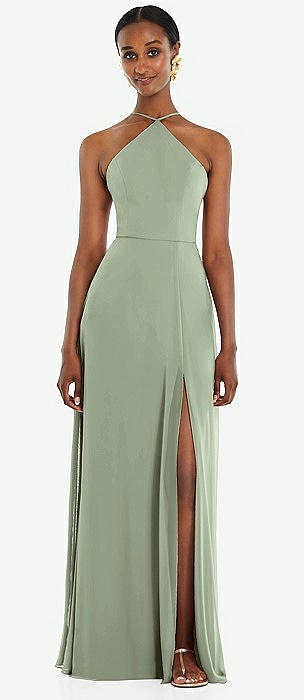 Stand Collar Halter Maxi Dress with Criss Cross Open-Back in sage