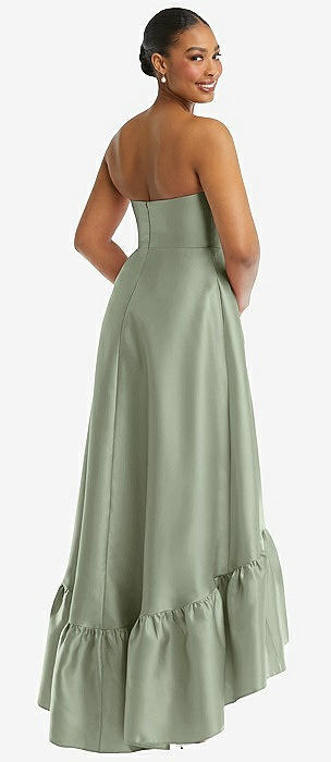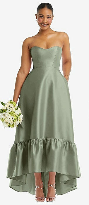 Strapless Deep Ruffle Hem Satin High Low Dress with Pockets in sage