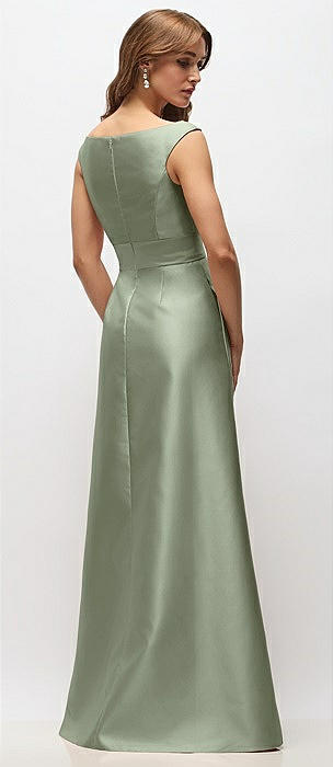 Basque-Neck A-Line Stretch Satin Maxi Dress with Off-the-Shoulder Drape in sage