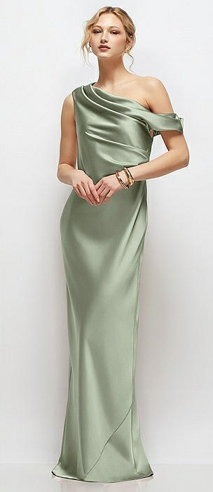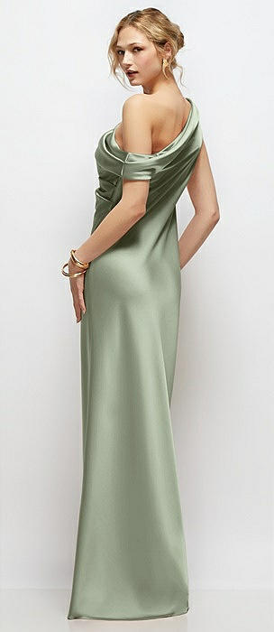 Draped One-Shoulder Bias Stretch Satin Maxi Dress in sage