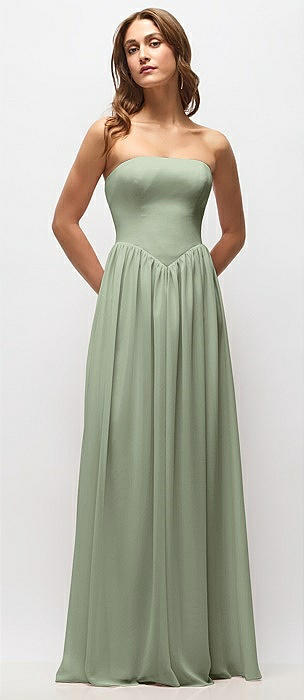 Strapless Basque Drop Waist Chiffon Maxi Dress with Shirred Skirt in sage