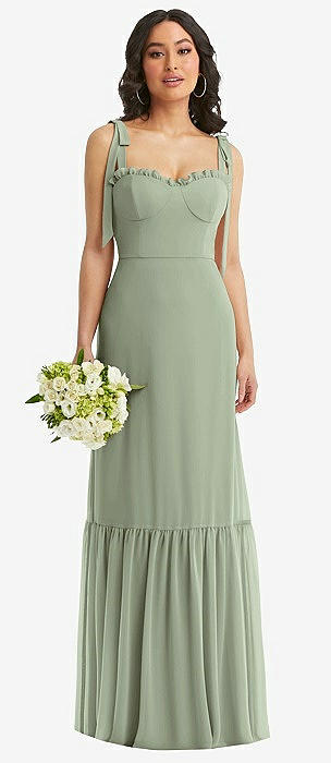 Tie-Shoulder Bustier Bodice Ruffle-Hem Maxi Dress in sage