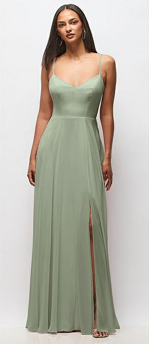 Spaghetti Strap Draped Skirt Gown with Front Slit in sage