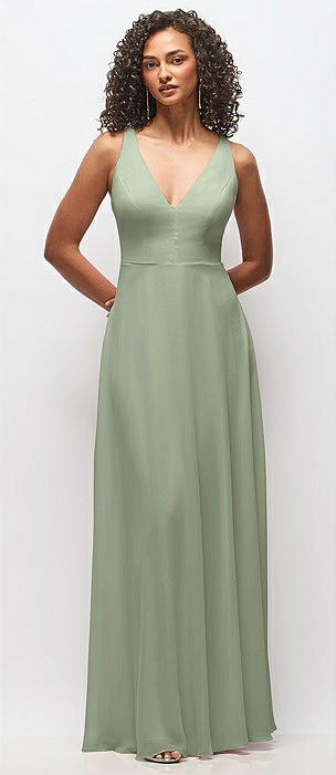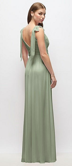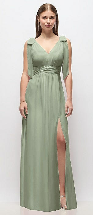 Plunge Neckline Bow Shoulder Empire Waist Chiffon Maxi Dress in sage