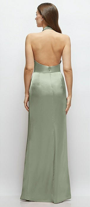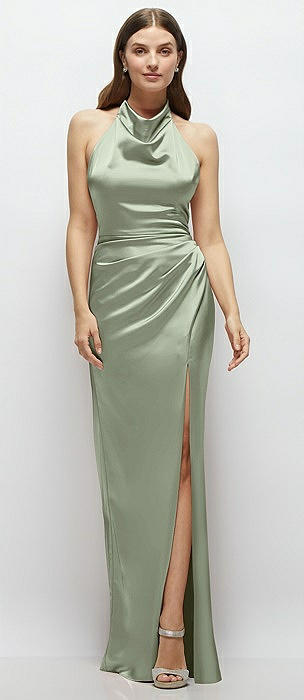Cowl Halter Open-Back Satin Maxi Dress in sage