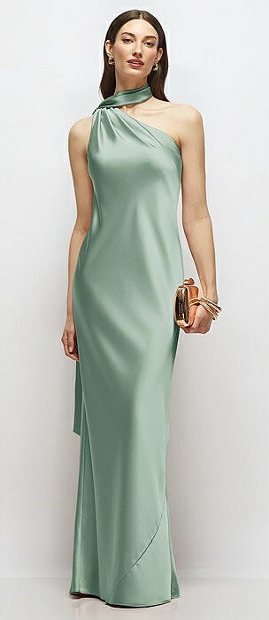 Draped Scarf One-Shoulder Bias Stretch Satin Maxi Dress in seagrass