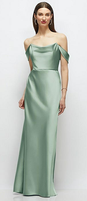 Basque-Neck A-Line Stretch Satin Maxi Dress with Off-the-Shoulder Drape in seagrass