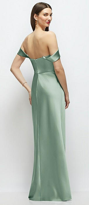 Asymmetrical Off-the-Shoulder Pleated Satin Maxi Dress in seagrass