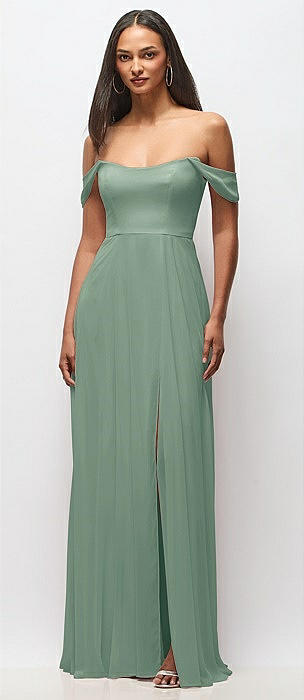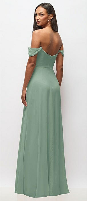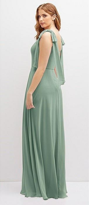 Bow-Shoulder V-Back Chiffon Gown with Front Slit in seagrass