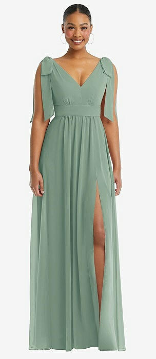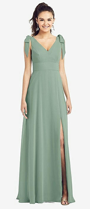 Bow-Shoulder V-Back Chiffon Gown with Front Slit in seagrass