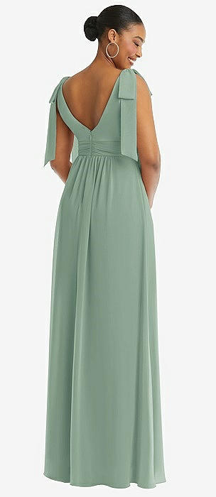 Plunge Neckline Bow Shoulder Empire Waist Chiffon Maxi Dress in seagrass