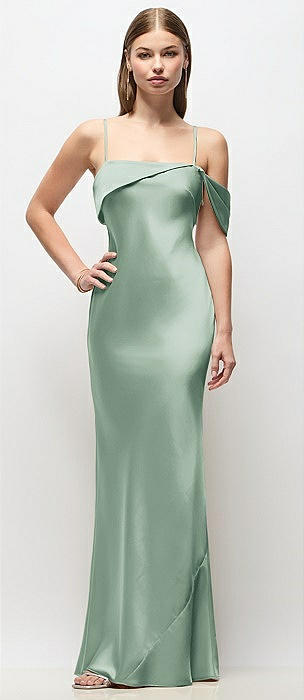 Asymmetrical Cuff Neck Stretch Satin Bias Maxi Dress with Adjustable Spaghetti Straps in seagrass