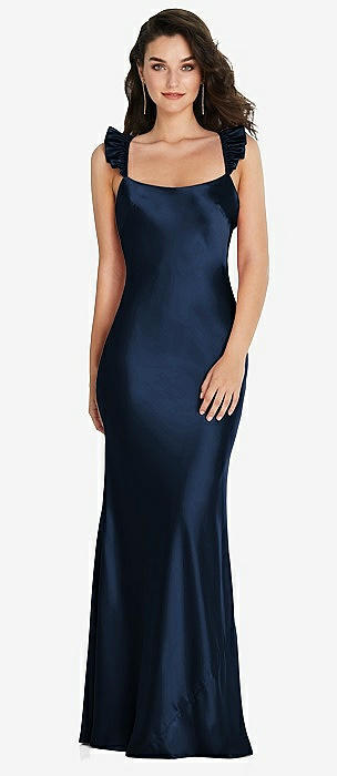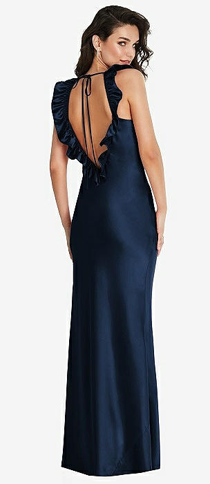 Ruffle Trimmed Open-Back Maxi Slip Dress in midnight navy