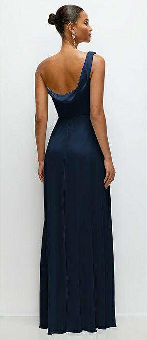Bow One-Shoulder Fluid Satin Maxi Dress with Full Skirt in midnight navy