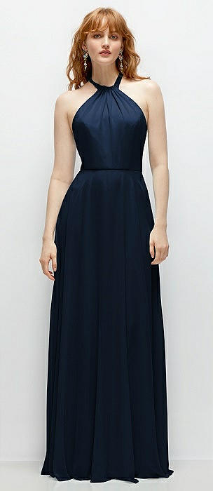 Shirred Halter Chiffon Maxi Dress with Back Sash-Tie Closure in midnight navy