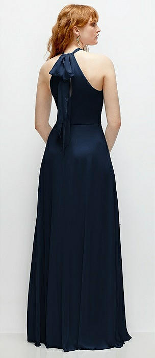 Band Collar Halter Open Back Fluid Satin Maxi Dress with Self-Tie Bow in midnight navy