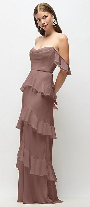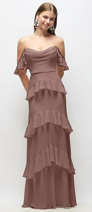 Off-the-Shoulder Cowl Chiffon Tiered Ruffle Maxi Dress with Convertible Ruffle Straps in sienna