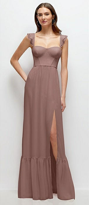 Ruffle Strap Chiffon Bustier Maxi Dress with Ruffle Hem A-Line Skirt in sienna