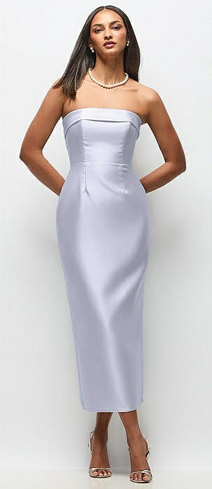 Strapless Cuff Satin Midi Dress with Column Skirt & Back Bow in silver dove