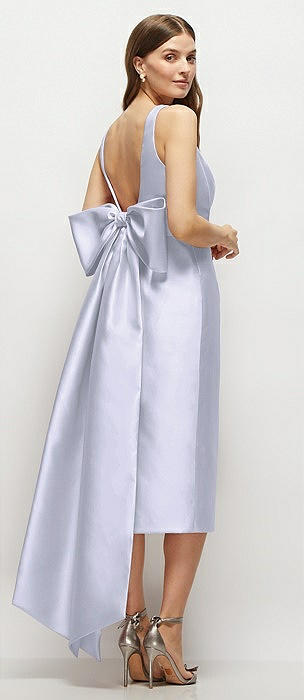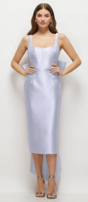 Scoop Neck Corset Satin Midi Dress with Floor-Length Bow Tails in silver dove