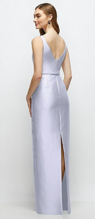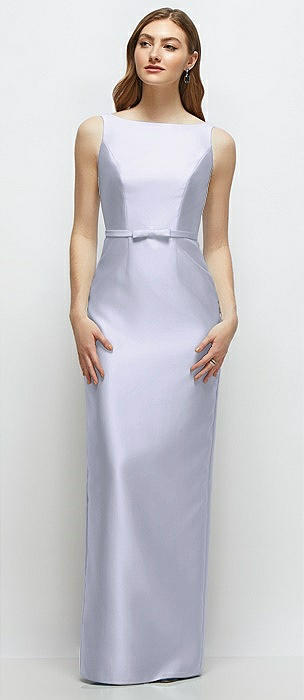 Bateau Neck Satin Column Dress with Bow-Trimmed Skinny Belt in silver dove