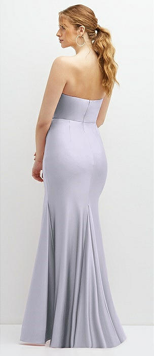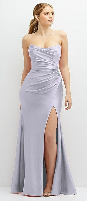 Strapless Basque-Neck Draped Stretch Satin Mermaid Dress with Horsehair Hem in silver dove