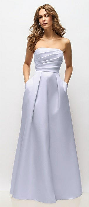 Strapless Hand-Pleated Bodice Satin Maxi Dress with Full Pleated Skirt in silver dove